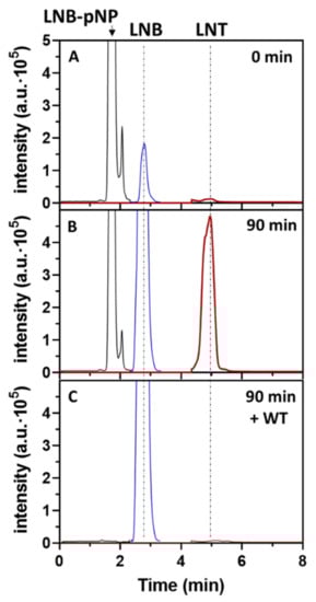 HPLC-MS monitoring of the transglycosylation reaction catalyzed by LnbB W394F. Reac- tion conditions: 1 μM enzyme, 2.5 mM LNB-pNP, 200 mM lactose, citrate-phosphate buffer pH 4.5. (A) t = 0 min; (B) t = 90 min, followed by heat inactivation; (C) After addition of wt LnbB (1 μM) for 15 min. Detection by EI-MS. Lactose acceptor is not shown since it is in large excess.