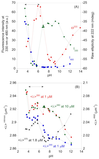 Taking the results of the three probes, it can be concluded that the pH-denaturation of the protein, followed by intrinsic fluorescence and CD, was basically the same (although, in one of them, the probe showed a decrease in the property and it had an increase in the other) with some differences in the behavior of both probes around physiological pH. The Θ222 and the fluorescence intensity at 330 nm (Figure 1A) showed constant values in a pH interval from around 8.0 to 9.0, and they changed at basic pH values, while they had a large variation when the protein precipitated. However, the Θ222 changed between pH 7.0 and 8.0, while the fluorescence intensity remained constant (Figure 1A). On the other hand, the ANS intensity did not seem to monitor the precipitation occurring between pH 3.5 and 6.5, since it was masked by the titration at acidic pHs, and in the interval between pH 6.5 and 8.5, there was no large variation in the ANS intensity; at basic pH values, the ANS intensity changed as the Θ222 and the fluorescence intensity at 330 nm did.