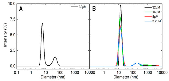 Self-association states of bsHPrK/P monitored by dynamic light-scattering (DLS): The DLS intensity distribution profiles of bsHPrP/K in pure water at 32 µM (A) and in 50 mM sodium phosphate buffer (pH 7.0) at different concentrations (B). Experiments were carried out at 25 °C.