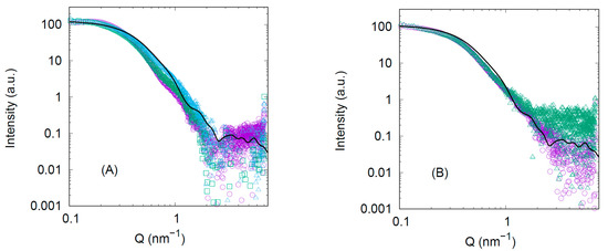 The SAXS analyses show that, in water, as the sample was more diluted, there were variations in the higher Q-range (Figure 3A); these variations could result from the presence of self-associated species (which could be those observed in DLS, Figure 2A, with Rh = 21.4 ± 4.4). SAXS curves in water did not show evidence of the monomer, because SAXS is proportional to molecule volumes; hence, if we have hexamers and monomers, we mainly see the hexamers. For the two protein concentrations explored in the presence of sodium phosphate (50 mM, pH 7.0), the normalized curves were the same, and thus there was no evidence of other species (Figure 3B). The Kratky plots under the different conditions are shown in the Supplemental Information (Figure S4); the bell shape of the Kratky plot representation confirms the compact structure of the protein in solution. The calculated gyration radius of the X-ray structure (PDB entry: 1KNX; as there is no X-ray structure for bsHPrK/P, this structure corresponds to the HPrK/P of Mycoplasma pneumoniae) for the hexamer is 4.4 ± 0.2 nm (black lines in Figure 3). In water, the gyration radius was 4.8 ± 0.2 nm, and in sodium phosphate it was 5.0 ± 0.2 nm. Both values were similar, within the margin of error, although that in the presence of sodium phosphate was slightly higher; we suggest that such a small difference might indicate the presence of a very low amount of other higher MW species.