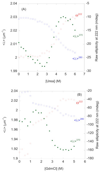 For the urea or GdmCl denaturations (followed by intrinsic or ANS <λ> and ellipticity at 222 nm), the same Equation (4) was used, although the denaturations were also irreversible, and then, quantitative conclusions about the values of the determined thermodynamic parameters cannot be obtained. In this case, the free energy for chemical denaturations follows a linear relationship with denaturant concentration (∆G = m ([denaturant]1/2 -[denaturant]) ), where m-value is the slope in the variation in the free energy of unfolding with the denaturant concentration (urea or GdmCl), and [denaturant]1/2 is the concentration of denaturant at which the fraction of unfolded protein equals 0.5 [61]), and the spectroscopic properties of the native and unfolded species are given by: YN = αN + βN [denaturant] and YD = αD + βD[denaturant].