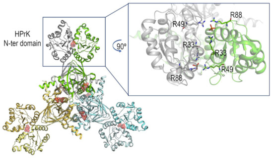 Structure of HPrK/P of Staphylococcus xylosus. (Left side) Hexamer of the HPrK/P from Staphylococcus xylosus (PDB entry 1KO7). The dimer in the asymmetric unit generates the hexamer through the symmetry operators. At the N-terminal domain of the HPrK/P, the interface between the dimer is stabilized by a salt bridge. (Right side) Detail of the salt bridge between the phosphate ions located at the interface and the arginine residues (shown in sticks). To facilitate the view of these interactions, the molecule has been rotated 90°. The figure was produced with Pymol [39].