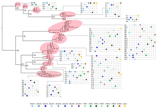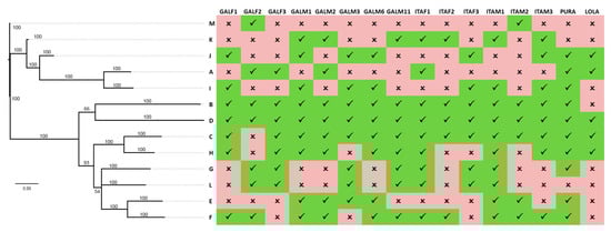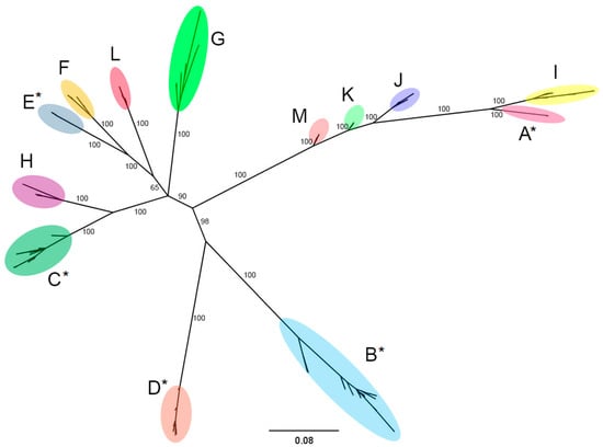 All the sequences were arbitrarily clustered in 13 different groups (A–M) according to their sequence identity, and a consensus sequence was then established for each cluster, enabling further downstream analyses.