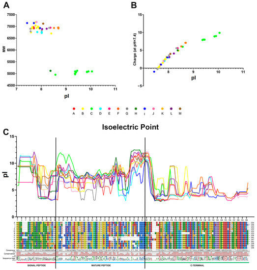 The isoelectric point (pI) and the charge of the mature peptide (at cytoplasmic pH = 7.4) of all the mytimycins were calculated using the Isoelectric Point Calculator software (http://isoelectric.org/, accessed on 1 February 2021) []. Moreover, the charge distribution of the complete peptide (consensus sequences) of the 13 groups of mytimycins (A–M) was analyzed through the calculation of the average pI based on a sliding window of 15 amino acids.