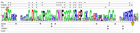 Datamonkey Adaptive Evolution Server (https://www.datamonkey.org/, accessed on 1 February 2021) [] was the software used to detect sites evolving under positive and negative selection. Specifically, the codon-aligned nucleotide sequences of the mature peptide coding region of all the mytimycins with an uninterrupted CDS were analyzed to detect sites evolving under episodic positive selection with the MEME algorithm [], as well as pervasive positive/negative selection using the FEL [], FUBAR [], and SLAC [] algorithms.