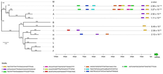 The promoter analysis identified 10 different motifs located in the 1000 pb upstream of the gene transcription start site (Figure 6). The most conserved motif shared by almost all the available sequences among the 13 clusters (i.e., the promoter regions could not be retrieved in some cases due to the excessive fragmentation of the genome assemblies) was the motif 1 (TGCTTGTTTAYTTWTAACAAYAATTTTAAG). This motif was only missing in the H cluster, which included several sequences with in-frame stop codons, and therefore is likely pseudogenic (Figure S1). The two phylogenetically close clusters J and K (Figure 1) shared several other motifs that could not be found in any of the other clusters. In general, mytimycin genes do not appear to show a robust promoter, as evidenced by the lack of conserved motifs in fixed relative positions.