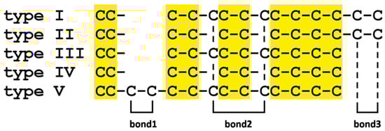 The three optional bonds are as follows: (i) bond 1 connects two consecutive cysteine residues found towards the N-terminal portion of the mature peptide of type V mytimycins, between the 2nd and 3rd Cys of the backbone array; (ii) bond 2 is found in type I, III, and V mytimycins; this disulfide bond connects the two optional cysteine residues found in tandem with the 5th and 7th Cys residues of the backbone array, and (iii) bond 3 is only found in type I and type II mytimycins and connects the two cysteine residues found at the C-terminal end of the mature peptide.
