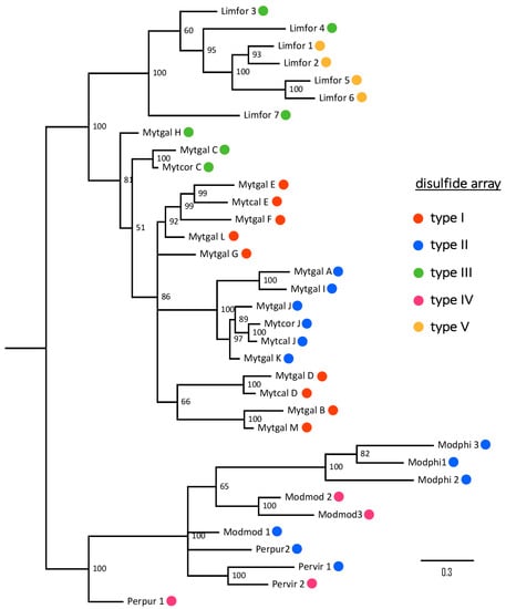 From an evolutionary perspective, the phylogenetic clustering of mytimycins was based on taxonomy rather than on the type of disulfide array (Figure 9). The observed topology of the tree strongly hints that different disulfide arrays have been independently acquired in the three main clades.