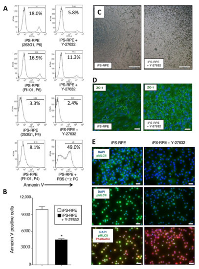 2.2. Inhibition of Apoptosis, Promotion of Pigmentation, and Detection of ZO-1, Phospho-Myosin Light Chain 2 in Y-27632-Treated iPS-RPE Cells