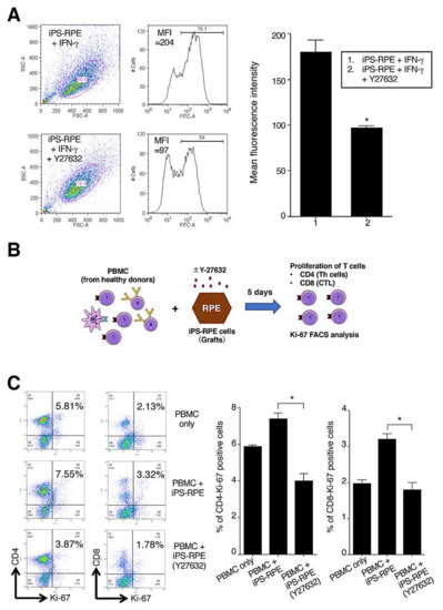 We also performed the lymphocytes–grafts immune reaction (LGIR) test using allogeneic lymphocytes and Y-27632-treated iPS-RPE cells. Details of the LGIR assay, including schematic presentation, are shown in Figure 3B. For nontreated RPE cells in the LGIR test (Figure 3C), there was proliferation of CD4+/Ki-67+ (proliferative helper T cells) in peripheral blood mononuclear cells (PBMC), and there was less proliferation of CD4+/Ki-67+ in PBMC with Y-27632-treated RPE cells. In addition, there was a statistically significant difference between nontreated and Y-27632-treated iPS-RPE cells. Moreover, as shown in Figure 3C, there was less proliferation of CD8+/Ki-67+ (proliferative cytotoxic T cells) with Y-27632-treated RPE cells compared with the PBMC plus RPE cells (no Y-27632). Taken together, these results indicated that Y-27632-treated iPS-RPE cells had low immunogenicity, at least in vitro.