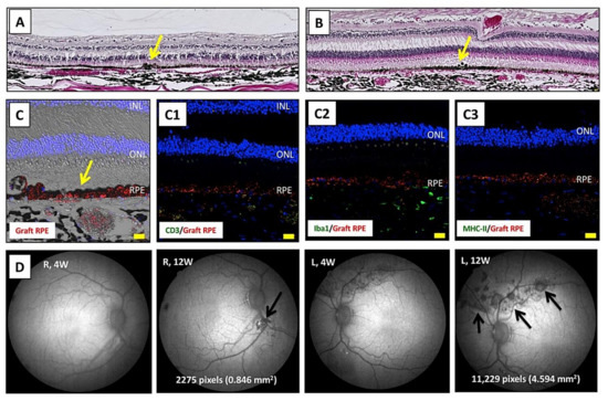 For the confirmation of graft survival, after monkey sacrifice, the eyes that were collected at 8 weeks (DrpZ11) or at 6 months (Hekoyayu, Utsubo) were fixed and embedded in paraffin (Sigma-Aldrich-Aldrich). Enucleated eyes were fixed in formaldehyde (Super Fix, Kurabo, Osaka, Japan) and then embedded in paraffin (Sigma-Aldrich). We first performed hematoxylin and eosin (H&E) staining before IHC evaluation. The retinal sections were blocked with 5% goat serum. The sections with primary antibodies against immune cells/factors (CD3, CD4, CD8, CD20, CD40, MHC-class II, IgG, NKG2A, and Iba1) were incubated at 4 °C overnight. Staining of retinal sections was performed, and antibody information was previously reported [25,30]. In order to trace the grafts after transplantation, we stained RPE cells with PKH (Sigma-Aldrich-Aldrich). Images were acquired with a confocal microscope (LSM700, Zeiss, Oberkochen, Germany).