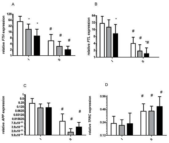 Response to physical effort on the gene expression level before (I) and after (II) 8 d of total starvation diet. Normalized expression of the following genes is shown: (A), FTH; (B), FTL; (C), APP; (D), TFRC. Before exercise, white bars; immediately after exercise, gray bars; 3 h after exercise, dark bars. Data are mean ± SE (n = 13). Analysis of each samples were done in triplicate. * Significant difference (p ˂ 0.05), baseline vs. post-effort. # Significant difference (p ˂ 0.05), I vs. II at the same time point. All mRNA levels are expressed as log2 expression relative to TUBB.