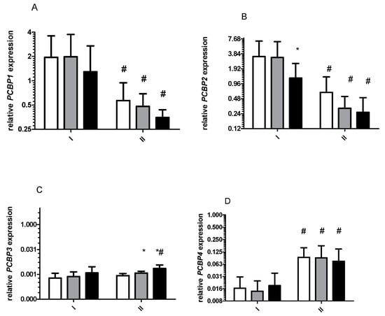 Response to physical effort on the gene expression level before (I) and after (II) 8 days of total starvation diet. Normalized expression of the following genes is shown: (A), PCBP1; (B), PCBP2; (C), PCBP3; (D), PCBP4. Before exercise, white bars; immediately after exercise, gray bars; 3 h after exercise, dark bars. Data are mean ± SE (n = 13). Analysis of each samples were done in triplicate * Significant difference (p ˂ 0.05), baseline vs. post-effort. # Significant difference (p ˂ 0.05), I vs. II at the same time point. All mRNA levels are expressed as log2 expression relative to TUBB.