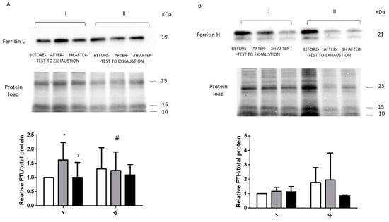 Response to physical effort of ferritin proteins. Representative immunoblot of ((A), FTL) and ferritin H ((B), FTH) levels before (I) and after (II) 8 d of total starvation diet. Differences in protein loading were normalized to total protein using stain-free gels. Data are mean ± SE of data for 10 subjects (FTL) or 9 subjects (FTH). * Statistical significance (p ˂ 0.05), baseline vs. post-effort. Analysis of each samples were done in single. # Statistical significance (p ˂ 0.05), I vs. II at the same time point. T Significant differences (p ˂ 0.05), immediately after vs. 3 h after the physical effort.