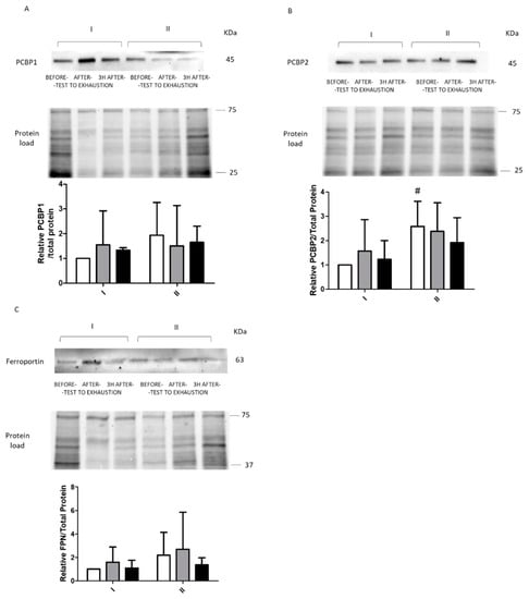Response to physical effort of ferroportin and iron chaperons. Representative immunoblot of PCBP1 (A), PCBP2 (B), and ferroportin ((C), FPN) levels before (I) and after (II) 8 d of total starvation diet. Differences in protein loading were normalized to total protein using stain-free gels. Bar graphs present the mean ± SE of data for 9 subjects (PCBP1), 6 subjects (PCBP2), and 7 subjects (FPN). Analysis of each samples were done in single # Statistical significance (p ˂ 0.05), I vs. II at the same time point.