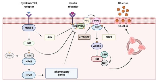 Crosstalk between inflammatory pathways and insulin-mediated glucose transport. Both Toll-like receptors (TLR) and cytokine receptor agonists—such as interleukin (IL)-1β—recruit the adaptor MyD88 (left). The activated MyD88, which involves the activation of the interleukin-1 receptor associated kinase (IRAK) family downstream, leads to the activation of the kinase inhibitor κ kinase (IKK), which in turn phosphorylates the nuclear factor kappa B (NF-κB) inhibitor IκBα, resulting in ubiquitin-dependent IκBα degradation. NF-κB is translocated to the nucleus and it initiates the transcription of proinflammatory genes. Furthermore, c-Jun N-terminal kinase (JNK) protein is activated through this pathway. JNK, IKK and inflammatory cytokines promote inhibitory phosphorylation in IRS on serine residues impacting insulin-mediated glucose transport (right). In physiological conditions, insulin binds to its receptor and recruits and phosphorylates IRS-1 on tyrosine residues, which then recruits PI3K via Src homology 2 (SH2) domains. PI3K promotes the phosphorylation of phosphatidylinositol bisphosphate (PIP2) at the plasma membrane to PIP3. Then, PIP3-dependent kinase (PDK) and mTORC2 phosphorylate and activate Akt. Activated Akt phosphorylates and inactivates AS160, allowing sustained Rabs activation of the trafficking of GLUT4 storage vesicles to the plasma membrane for the surface expression of GLUT4.