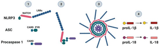 The nucleotide-binding oligomerization domain-like receptor family (NOD-like) pyrin domain containing 3 (NLRP3) inflammasome complex. The NLRP3 inflammasome is part of the NLR protein family which contains a pyridine 3 domain (NLRP3). The NLRP3 protein (1), through the internal interaction between the NACHT domain (or also referred to as NOD) and LRR (leucine-rich repeats), is self-repressed under normal cellular conditions. In the presence of pathogen-associated molecular patterns (PAMP) of microorganisms, damage-associated molecular patterns (DAMP) or metabolic perturbances, this self-repression is removed. The exposition of the NACHT domain leads to the oligomerization and recruitment of both ASC protein—through its PYR domain—and procaspase-1 through its CARD domain (2). Oligomerization or assembly triggers the activation of caspase-1 (3) and the processing of pro-inflammatory interleukins such as IL-1β and IL-18 (4).
