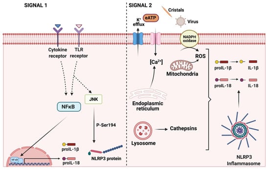 Activation of the NLRP3 inflammasome signaling pathway requires two signals. The signal 1 or priming (left) is provided by the activation of TLRs or cytokine receptors, leading to the NF-κB activation that upregulates the levels of several inflammasome components such as the protein NLRP3, proIL-1β and proIL-18. In addition, during the priming step, JNK-mediated phosphorylation occurs at S194 of NLRP3. Signal 2 or activation (right) is provided by any of numerous PAMPs or DAMPs including virus, cholesterol, potassium efflux, reactive oxygen species (ROS), extracellular ATP and lysosomal dysfunction, among others. ASC, an adaptor protein, recruits NLRP3 and procaspase-1 to form the NLRP3 inflammasome complex. Caspase 1 promotes the processing of interleukins for its subsequent release.