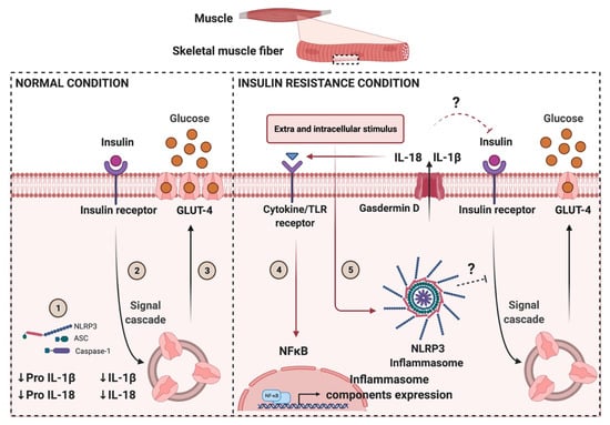 In obese and T2D patients, there is an elevation of multiple cytokines, including those with NLRP3-dependent activation, such as IL-1β and IL-18 [,,]. Both IL-1β and IL-18 are members of the IL-1 family []. Less is known about IL-1β in skeletal muscle compared with other tissues with a high metabolic rate. In vitro studies have shown that chronic treatment with IL-1β slightly decreases GLUT4 expression and markedly inhibits its insulin-induced translocation to the plasma membrane in murine and human adipocytes [,]. It has been reported that HFD feeding stimulates IL-1 type I receptor (IL-1R), mediating intracellular inflammatory signaling in murine skeletal muscle, suggesting that the IL-1R type I/Myeloid differentiation primary response 88 (MyD88)/NF-κB signaling pathway is involved in the skeletal muscle inflammatory response in a diet-induced obesity model []. Notably, the NF-κB pathway controls the expression of inflammatory cytokines involved in the pathogenesis of insulin resistance [,]. Elevated NF-κB activation is conserved in human myocytes cultured from obese T2D patients, confirming the muscle’s contribution to the inflammatory response []. Moreover, hypercholesterolemia induces inflammation by the activation of TLR-dependent pathways and, subsequently, the NF-κB-mediated release of a broad range of cytokines and chemokines, including IL-1β [].