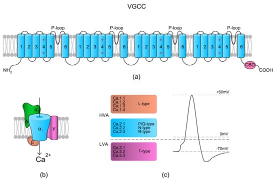 Voltage-gated Ca2+ channels (VGCCs) are a group of voltage-gated ion channels that activate on membrane depolarization and mediate Ca2+ influx in response to action potential and subthreshold depolarizing signals []. Due to different physiological, pharmacological, and regulatory properties, there are several types of VGCCs, including L-, N-, R-, P/Q-, and T-type channels (Figure 1c). A VGCC is a heteromultimer consisting of several different subunits, including the α1 (encoded by CACNA1 genes), α2δ (CACNA2D), β (CACNB), and γ (CACNG) subunits, of which α1 is a core-forming subunit (Figure 1a,b) []. Nevertheless, the presence of the γ subunit in certain channels is putative. Regarding the structural topologies, all VGCCs are similar but not identical in terms of their resulting properties []. A scheme of the VGCC structure is presented in Figure 1.