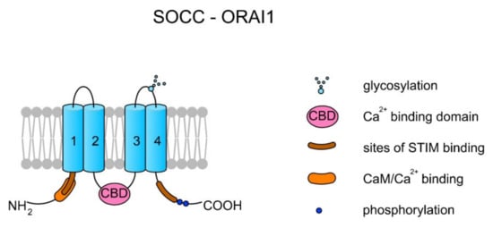 Topology of a store-operated Ca2+ channel (SOCC) created by ORAI1. Each ORAI protein has four TMs. TM2 and TM3 create a pore. There are two sites for STIM1 binding at the N- and C-termini. The interaction between STIM1 and ORAI activates the channel and the release of Ca2+ from the endoplasmic reticulum (ER). The binding of Ca2+ by the Ca2+ binding domain (CBD) localized on the central loop inactivates the channel []. Additionally, it can also be inactivated upon CaM binding [].