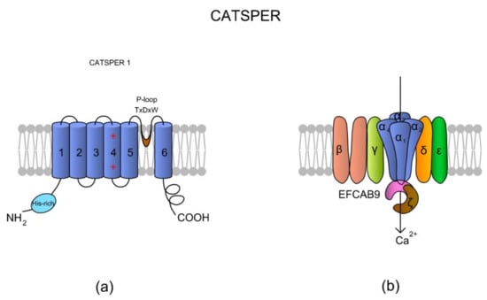 CatSper is a heterotetrameric complex consisting of four pore-forming α subunits (CatSper1-4) and six additional auxiliary subunits: CatSperβ (beta), CatSperγ (gamma), CatSperδ (delta), CatSperε (epsilon), CatSperζ (zeta), and the EF-hand calcium-binding domain-containing protein 9 (EFCAB9), which are encoded by at least 10 genes [,,,,]. Sequence identity between CatSper1–4 subunits is rather low and ranges from 16 to 22% []. Apart from differences in amino acids composition, the all α subunits differ with lengths of their loops and N- and C-termini.