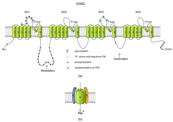 A structure of a voltage-gated Na+ channel (VGNC) based on a SCN2A isoform. (a) The α subunit is created by four repeat domains (RD1–RD4) that each have six TMs. Classically, TM1–TM4 of each domain form a VSD where TM4 acts as a positively charged sensor. During depolarization, TM4 is believed to move toward the extracellular surface, allowing the channel to become permeable to ions. Na+ is transported inside a cell through a pore (P-loop) formed between TM5 and TM6 of each RD. The RDs are connected with long intracytoplasmic loops with sites for protein phosphorylation via PKA and PKC []. The cytoplasmic loop between RD3 and RD4 contains an “h” (I × F × M sequence) motif, which stands for a hydrophobic triad of amino acids, namely, isoleucine, phenylalanine, and methionine (I1488, F1489, and M1490). The IFM motif is involved in the inactivation of VGNC, serving as a hydrophobic latch for a hinged lid formed by the loop between RD3 and RD4 []. Phosphorylation in the RD1/RD2 and RD3/RD4 loops modulates the channel inactivation (adapted from Reference [], revised in Reference []). (b) A cartoon of VGNC created by the pore-forming α subunit and the two auxiliary β subunits.