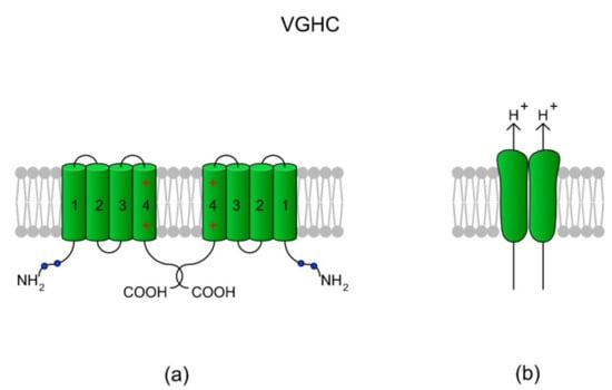 The main role of a voltage-gated H+ channel (VGHC, which is encoded by the HVCN1 gene in humans) is to extrude H+ from a cell, leading to an increase in pHi. VGHCs have been found in a diverse spectrum of species, ranging from unicellular marine animals to humans, and also within different cell types []. The channels are characterized by highly selective H+-conductance, opening with membrane depolarization, high extracellular pH and decreased pHi (high ∆pH), strong temperature dependence for both conduction and gating, and an absence of inactivation []. Additionally, VGHCs are activated by the endocannabinoid anandamide and via the removal of extracellular Zn2+ which is a proton channel blocker []. In chordates (Ciona intestinalis, mice, and humans), VGHCs are dimers; however, the monomers are also functional as each monomer has its own conduction pathway. Each VGHC monomer consist of only four TMs which create VSDs in other voltage-gated channels. Interestingly, Berger et al. [] identified an alternative isoform of VGHC in human spermatozoa, namely Hv1Sper. The isoform is formed from VGHC via the removal of 68 amino acids from the N-terminus during post-translational proteolytic cleavage, which consequently makes Hv1Sper more sensitive to ∆pH. Moreover, VGHC and Hv1Sper can form heterodimers. According to the authors, the cleavage and heterodimerization of Hv1Sper may be an adaptation to the specific requirements for pH control in spermatozoa []. A schematic of the VGHC structure is presented in Figure 7.