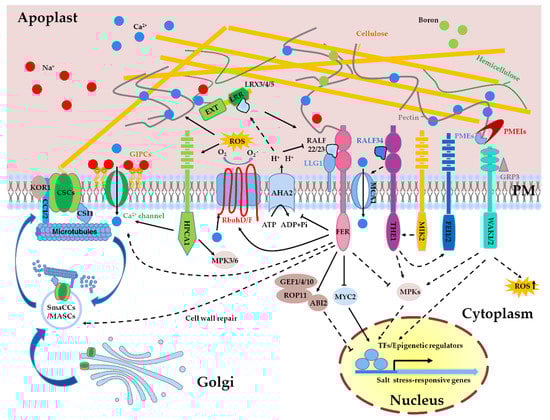 In the early 1970s, the acid growth theory was proposed, which states that acidification of the apoplast promotes cell elongation, whereas alkaline state in the apoplast prevents cell growth [109]. The reduction of apoplastic pH (apopH) activates several cell wall proteins, including expansins and other remodeling enzymes, resulting in the loosening of cell wall [110]. apopH in linear growing cells is regulated by plasma membrane-localized H+-ATPases (AHAs) [111]. RALFs are a class of peptides that cause the alkalinization of the apoplast by regulating H+-ATPases via Catharanthus roseus RLK1-like kinases (CrRLK1Ls). FER is one of the CrRLK1L family proteins that consist of two carbohydrate-binding malectin-like domains, a transmembrane domain, and an intracellular serine/threonine-kinase domain [112,113]. FER inhibits the proton transport activity of AHA2 likely via direct phosphorylation [114]. It is known that salinity triggers the transient alkalization in the apoplast and inhibits plant growth [115], and our study showed that salt stress can induce the formation of mature RALFs [10]. These data suggest that salt stress-induced alkalinization of the apoplast is probably mediated by RALFs-FER-AHA2 module and the acidification of the extracellular environment is important for salt tolerance. Two halophyte species, Atriplex lentiformis and Chenopodium quinoa, which have a capacity to tolerate a high concentration of sodium ion, display a high H+-ATPase activity under salt stress, which contributes to a low apopH and fast Na+ efflux [116]. SOS1, encoding a plasma membrane membrane-localized Na+/H+ antiporter, is required for the extrusion of excessive Na+ from the cytosol [117]. The Na+/H+ exchange activity of SOS1 is absent under normal growth conditions. Upon salt stress, however, Na+-induces induced formation of an ATP-dependent pH gradient can enhance the Na+/H+ transport activity of SOS1 [118]. Altogether, low apopH facilitates plant growth under salt stress, but the direct effects of low apopH on cell wall networks need more detailed studies.