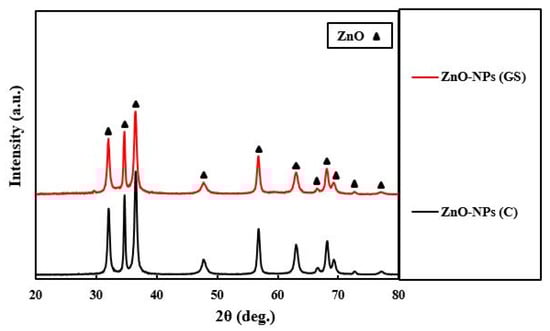 The sharp diffraction peaks confirmed that the obtained ZnO-NPs were crystalline in nature. Scherer’s equation (Equation (1)) was used to calculate the mean crystallite size of the ZnO-NPs.