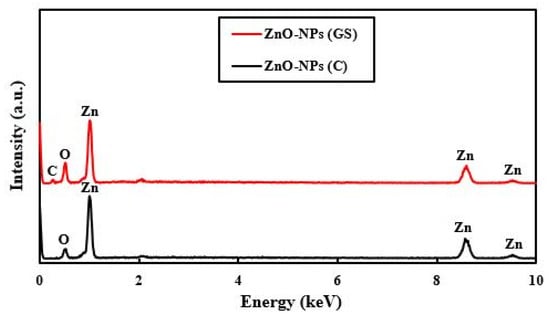 Energy-dispersive X-ray spectroscopy (EDX) spectra of commercial (C) and green synthesized (GS) ZnO-NPs.