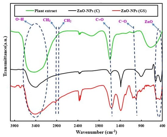 Fourier-transform infrared spectroscopy (FTIR) spectra of Thymus pubescent extract, commercial (C) and green synthesized (GS) ZnO-NPs.