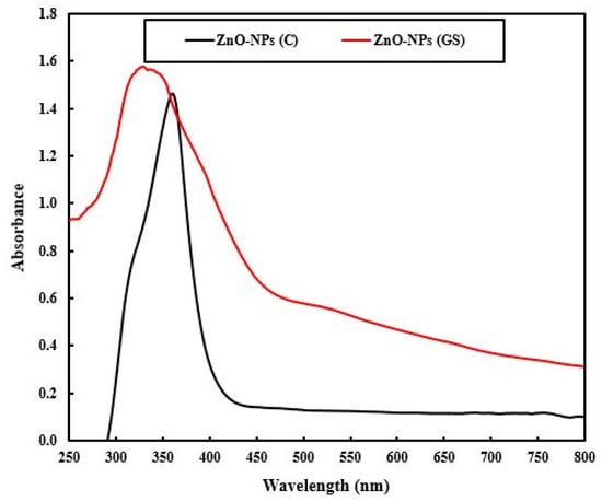 UV–vis diffuse reflectance spectroscopy (DRS) spectra of commercial (C) and green synthesized (GS) ZnO-NPs.