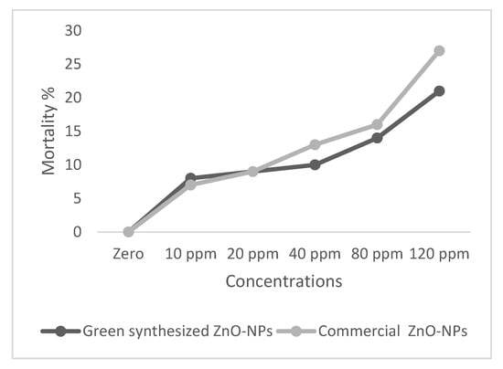 Fish were exposed to different concentrations of commercial and green synthesized ZnO-NPs, mortality was counted for 96 h (Figure 6), and lethal concentrations were calculated accordingly (Table 1 and Table 2). LC50 96 h of commercial and green synthesized ZnO-NPs has recorded 59.95 and 78.9 mg.L−1 respectively.