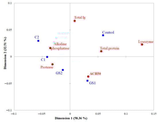 Correspondence analysis ordination plot and position of the five analyzed groups (control, GS1, GS2, C1, and C2) to the analyzed immune parameters.