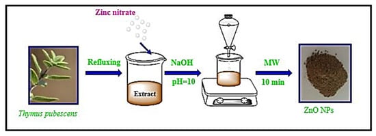 The green leaves of Thymus pubescens were washed with distilled water and dried at 25 °C for 6 days. Then, 100 mL of distilled water was added to the powdered dried materials (20 g) and the resulting solution was incubated at 95 °C for 24 h and thoroughly mixed using a magnetic starrier (180 rpm) to allow a proper extraction. Finally, the solution was centrifuged at 5000× g for 5 min and kept at 4 °C until use. For the preparation of the ZnO-NPs, zinc nitrate (5 g) was dissolved in 80 mL distilled water and 20 mL of the extract at 37 °C under stirring. Afterward, 5 M NaOH was added to the solution in a drop-wise manner until pH 10 was achieved. The suspension was then placed in a microwave oven for 10 min. The precipitate was centrifuged at 2000× g for 6 min, washed with distilled water and ethyl alcohol, and dried at 60 °C overnight (Figure 8).