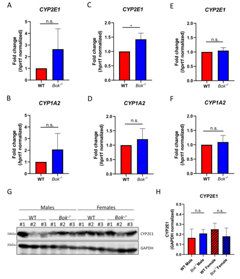 CYP2E1 mRNA but not protein expression is increased in Bok-/- males at baseline. qPCR analysis revealed increased expression of CYP2E1 and CYP1A2 in primary hepatocytes derived from Bok-/- male mice compared with wildtype (WT) (A,B). Expression of CYP2E1, but not CYP2A1 was significantly increased in whole liver lysates derived from Bok-/- males compared with WT (C,D). In whole liver lysates of female WT and Bok-/- mice CYP2E1 (E) and CYP1A2 (F) were expressed at similar levels. CYP2E1 protein levels were comparable in whole liver lysates of untreated WT and Bok-/- mice (G,H). Results are depicted as a fold change compared to sex-matched WT (A–F) or as GAPDH normalized values (H). Data are represented as mean ± S.D. and are derived from 3 mice per group. *: p < 0.05; n.s.: not significant.