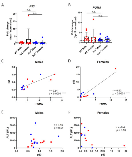 P53 has been described to play a protective and attenuative role in APAP-induced hepatic injury, yet the underlying mechanism is still obscure [42,43,44]. Since we previously found that BOK-deficient cells (HCT116 and HepG2) and liver lysates derived from Bok-/- mice show a higher baseline expression of p53 at both the transcriptional and protein levels [40,45], we tested p53 expression in the liver after APAP treatment by RT-qPCR. As shown in Figure 2A, similar expression levels of p53 were detected in both sexes of WT and Bok/- mice. The BH3 only protein and p53 downstream target PUMA has been reported to contribute to APAP-induced hepatotoxicity [21]. Indeed, our data showed that APAP induces the expression of PUMA in WT and in Bok-/- mice (Figure 2B). Furthermore, p53 expression levels correlated linearly with those of PUMA in both males and females (Figure 2C,D), but not with the severity of liver injury as assessed by the levels of ALT in the serum (Figure 2E,F).