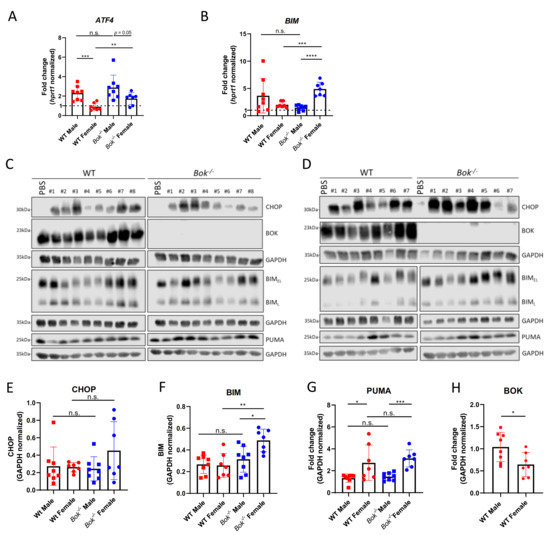 Acetaminophen (APAP) induces ER stress signaling. Transcriptional induction of ATF4 in response to APAP was increased in males compared to females (A) and increased in Bok-/- females compared to WT females (A). In all mice, BIM was induced transcriptionally with significantly increased induction in Bok-/- females compared with Bok-/- males and WT females (B). A Western blot of total liver lysates from males (C) and females (D) showed similar protein expression levels of BIM and CHOP in WT and Bok-/- mice, except for higher BIM expression levels in Bok-/- females (C–F). PUMA protein was more strongly induced by APAP in females than in males with similar expression levels between genotypes (C,D,G). BCL-2-related ovarian killer (BOK) was downregulated in WT females (D,H) but not in WT males (C,H). Results are depicted as a fold change compared to sex- and genotype matched PBS controls (A,B,G,H) or as GAPDH normalized values (E,F). Data are represented as mean ± S.D. and are derived from 8 to 9 mice per group. *: p < 0.05; **: p < 0.01; ***: p < 0.001; ****: p < 0.0001; n.s.: not significant.