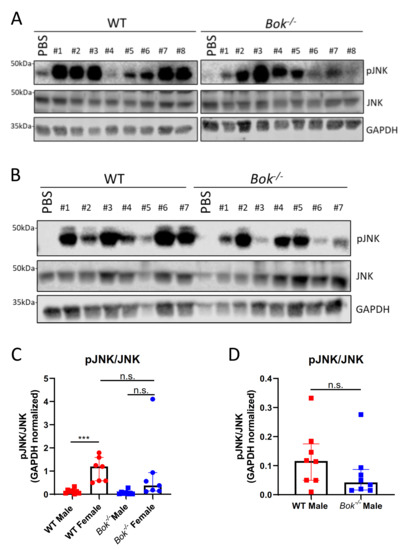 Activation of JNK after APAP treatment. The JNK pathway was activated in livers of males (A) and females (B) of both genotypes after 5 h of APAP treatment. pJNK was significantly increased in WT females compared with WT males and reduced in both Bok-/- females (C) and males (D). (D) shows data of male mice from (C) as close-up. Data are represented as mean ± S.D. and are derived from 7 to 8 mice per group. ***: p < 0.001; n.s.: not significant.