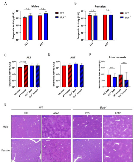 The impact of BOK on the severity of liver damage is moderate and sex dependent. ALT and AST levels were similar in WT and Bok-/- males (A) and females (B) after 5 h APAP. ALT and AST levels did not significantly differ between males and females (C,D). Histologically, centrilobular necrosis was detected in WT and Bok-/- mice. Haematoxylin and eosin stain (E). Scale bars = 1 mm. The extent of centrilobular necrosis (indicated as a mean percentage of affected centrilobular-portal vein distance) was higher in WT mice compared to Bok-/- mice, with the lowest values in Bok-/- females (F). Data are represented as mean ± S.D. and are derived from 8 mice per group. n.s.: not significant.