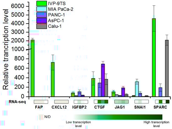 SPARC genes in the primary culture of human fibroblasts IVP-9TS, in pancreatic cancer cell lines (MIA PaCa-2, PANC-1, AsPC-1) and lung cancer (Calu-1) cell line by quantitative real-time PCR (qPCR). The obtained transcription profiles of the