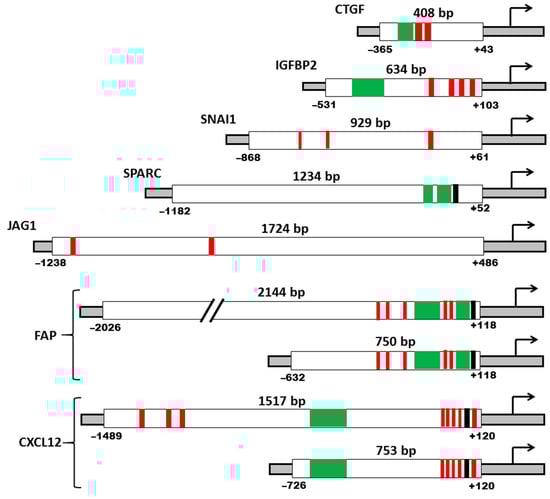 For the FAP and CXCL12 genes, which were specifically transcribed in fibroblasts, two promoter fragments were chosen: the first, the minimal promoter, and the second, the promoter with distal promoter elements, in order to evaluate their contribution to the possible specific regulation of the promoter activity.