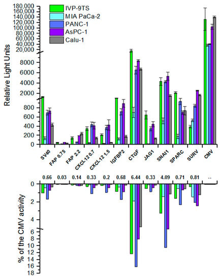 Really, the universal viral promoters CMV and SV40 showed a higher level of activity in fibroblasts as compared to cancer cells. This fact, as well as the shown low activity of most promoters, suggests that the universal promoters may be suitable for providing expression in CAFs, although this may sacrifice the selectivity for promoter activity. Other drawbacks of many universal promoters is silencing, even when administered as part of artificial constructions by non-viral vectors [