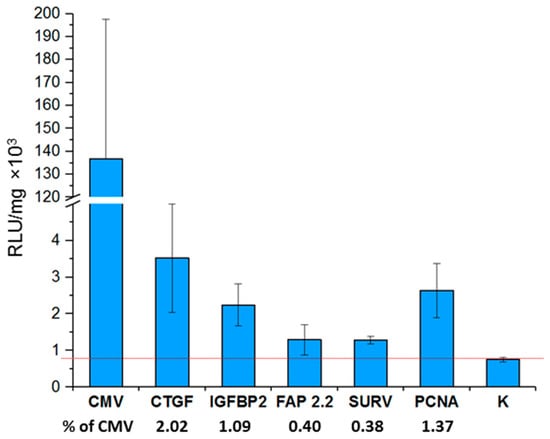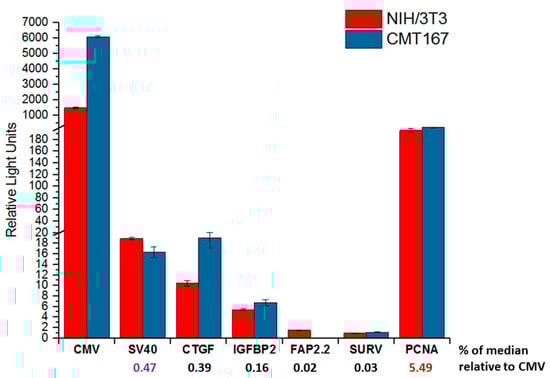 56]. Thus, in addition to promoters that are active in CAFs and have a certain set of TFs characteristic of this cell type, we took the universal mammalian PCNA promoter. Its TFs pattern is associated with the cell replication apparatus, a more universal feature (cell division) than selective expression in a particular cell type, and which is less subjected to silencing than the CMV [