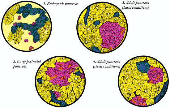 - Solar, M.; Cardalda, C.; Houbracken, I.; Martin, M.; Maestro, M.A.; De Medts, N.; Xu, X.; Grau, V.; Heimberg, H.; Bouwens, L.; et al. Pancreatic exocrine duct cells give rise to insulin-producing beta cells during embryogenesis but not after birth. Dev. Cell 2009, 17, 849–860. [Google Scholar] [CrossRef] [PubMed]