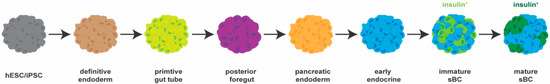 The most successful protocols that have been developed for differentiating beta cells from hPSCs faithfully recapitulate the developmental cues that a cell would normally receive in an in vivo context (Figure 2). As our knowledge of human pancreas development is limited, directed differentiation of hPSCs to stem cell-derived beta cells (sBCs) is largely based on knowledge derived from animal models of pancreas development and disease. Initial protocols from several labs succeeded in producing cells that phenotypically resembled primary human islets and were capable of reversing diabetes in rodent models [149,150,151]; however, none of these protocols resulted in a uniform population of fully functional beta cells [152]. In each case, these sBCs were found to be immature, resembling human fetal beta cells as defined by their gene expression profiles, truncated dynamic glucose stimulated insulin secretion (dGSIS) profiles (reviewed in Figure 3), insulin processing efficiency (as demonstrated by an elevated proinsulin/insulin ratio) and lower total insulin content [150]. However, upon long-term transplantation in diabetic mice, the immature sBCs appeared to gain functionality and were able to rescue the diabetic phenotype [149,150,151].