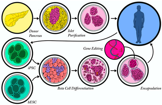 Human embryonic stem cells (hESCs) are derived from the inner cell mass (ICM) of the embryo at the blastocyst stage of development [147]. They are characterized by their ability to undergo self-renewal and to differentiate into any cell type in the body; in short, they represent an unlimited source of cells for cell-based therapy. Induced pluripotent stem cells (iPSCs) were first generated in 2007 by the Yamanaka lab in Japan [148]. These iPSCs represent pluripotent cells with similar properties to hESCs, but unlike hESCs they are derived from terminally differentiated cells. Initially, iPSCs were generated from donor skin biopsies and reprogrammed using four transcription factors—OCT4, cMYC, KLF4 and SOX2 (known as the Yamanaka factors)—to become bone fide stem cells. These cells are pluripotent and proliferative, and most significantly, retain the genetic profile of the person from which they were derived. These features make it possible to take adult somatic cells from any patient, reprogram them to iPSCs, and then differentiate them to a cell type of interest, such as islet beta cells, that can then be transplanted without immune consequences or the need for immunosuppression.