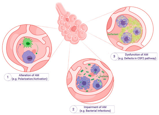Impairment of alveolar macrophages leads to specific diseases or infections. Alveolar macrophages (AM) are the most abundant cell type in the bronchioalveolar space. Given the high plasticity of AM and the possibility to switch between different activation stages, alteration of AM can lead to a nonfunctional polarization/activation and subsequent alterations in, e.g., maintaining tissue homeostasis (1). Furthermore, genetic and environmental factors can also influence the antimicrobial function of AM, which can lead to life-threatening pulmonary infections (e.g., bacterial airway infections) (2). Dysfunction of AM due to genetic mutations or other factors can also alter signaling pathways (e.g., the CSF2 pathway), which ultimately can lead to impaired tissue homeostasis, e.g., clearance of surfactant material, as seen in Pulmonary Alveolar Proteinosis (3) (Created with BioRender.com).