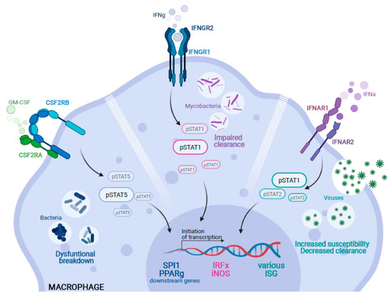 Genetic alterations causing impairment of alveolar macrophages in the context of pulmonary infection. Inborn errors in various genes can lead to alveolar macrophage dysfunction. (I) Following binding of GM-CSF, the CSF2R complex (CSF2RA/B) initiates downstream signaling by phosphorylation of STAT5 (pSTAT5) to activate important target genes such as SPI1 or PPARγ. Thus, mutations in either CSF2RA or CSF2RB lead to a block of GM-CSF signaling which can impair proper breakdown of bacteria. (II) Similarly, IFNγ activates the IFNgR1-IFNgR2 signaling complex and induces downstream phosphorylation of STAT1 (pSTAT1) and the subsequent activation of target genes such as members of the Interferon-regulatory factors (IRF) or iNOS. An impairment of this signaling cascade leads to the impaired clearance of mycobacterial infections and the clinical symptoms of Mendelian Susceptibility to Mycobacterial Disease. (III) Moreover, loss of function mutations in type-I interferon receptors (IFNAR1/R2) can impair the phosphorylation of STAT1 and 2 (pSTAT1/2) and their respective downstream signaling. This results in an increased susceptibility and decreased clearance capacity of macrophages against viral pathogens (Created with BioRender.com).
